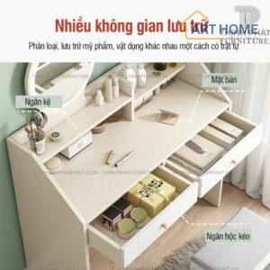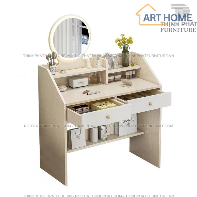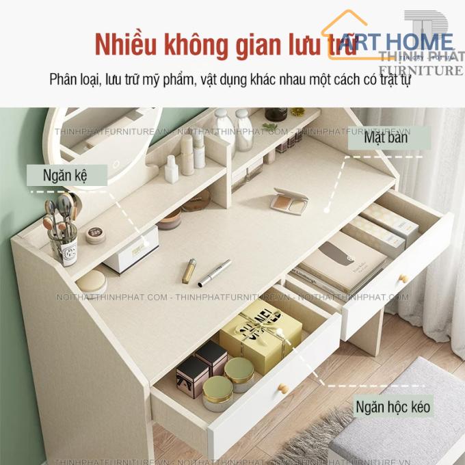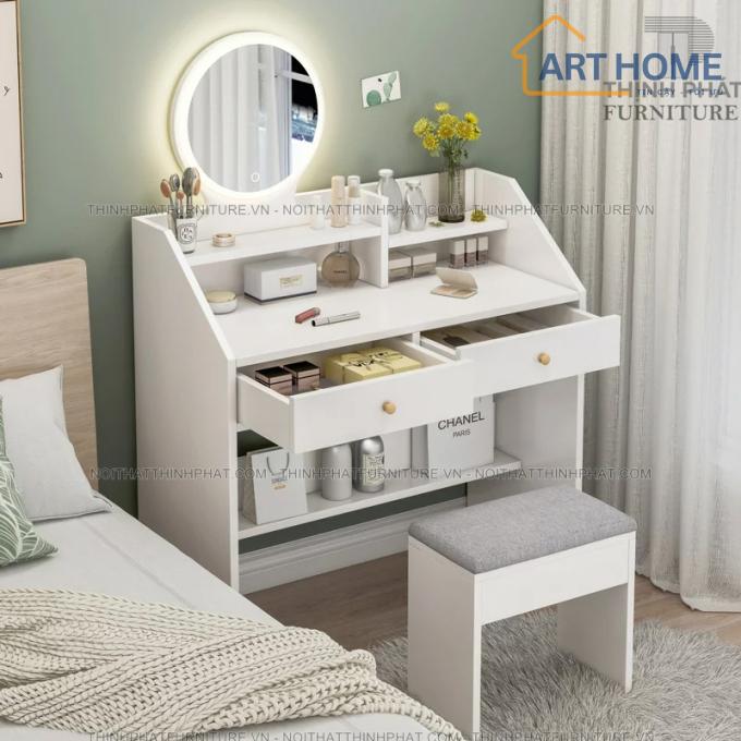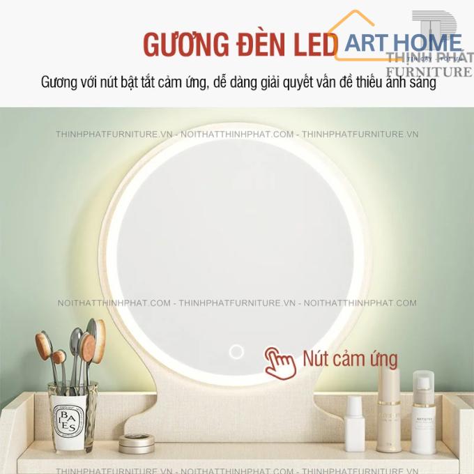 Sản phẩm bao gồm: 1 bàn trang điểm gắn gương tròn đèn led + 1 ghế đôn nệm